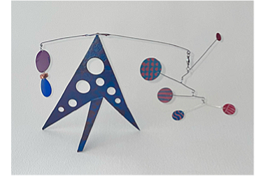 Recently she has expanded her practice to include kinetic objects— such as mobiles and tabletop stabiles. These whimsical pieces have been crafted from recycled materials and influenced by Alexander Calder.